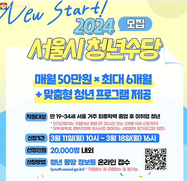 서울 거주 청년들이 진로탐색과 구직활동에 전념할 수 있게 월 50만원씩 최대 6개월간 지원금을 지급하는 프로그램으로, 전문가 진로상담, 취업 멘토링 특강 등도 함께 지원
