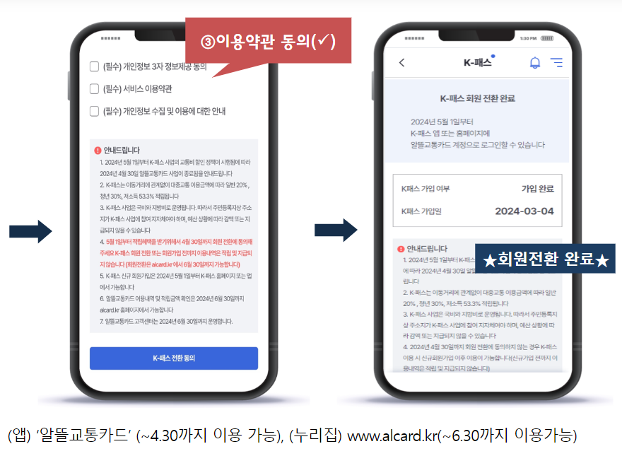 4월 30일까지 전환을 완료한 이용자는 K-패스가 시행되는 5월 1일부터 즉시 K-패스 혜택을 적용받는다. 전환을 미리 완료하지 않은 이용자는 회원 전환을 완료하기 전까지 K-패스 환급 혜택을 받을 수 없다.*